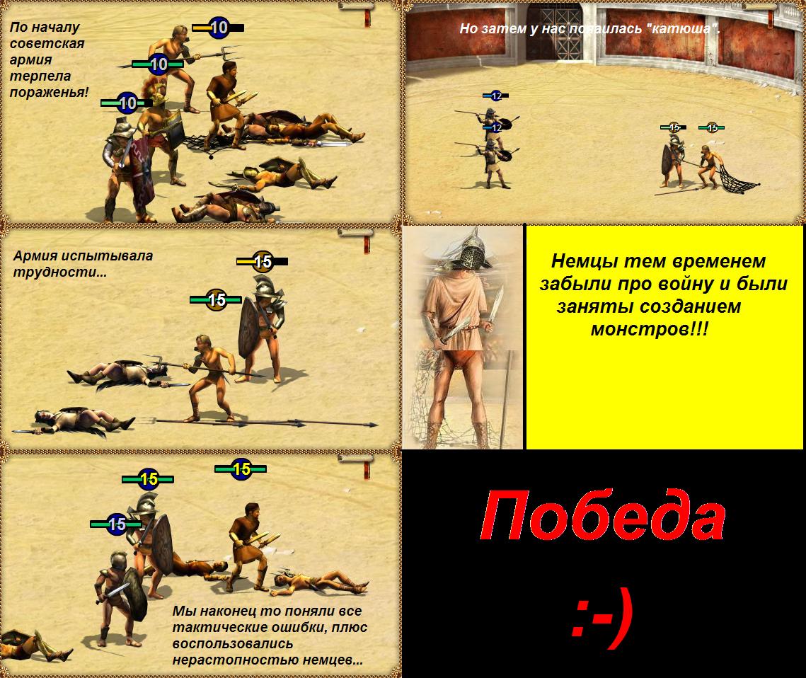 Я хотел отправить вам смешные игры, которые поднимают настроение. Однажды я участвовал турниру, среди гладиаторов очень много были раненые. Но я отправил их к бою. Пожалуйста смотрите эти бои. 1. http://gladiators.ru/xml/arena/online.php?id=58130868 2. http://gladiators.ru/xml/arena/online.php?id=58134150 3. http://gladiators.ru/xml/arena/online.php?id=58135747 4. http://gladiators.ru/xml/arena/online.php?id=58137335 5. http://gladiators.ru/xml/arena/online.php?id=58137770 6. http://gladiators.ru/xml/arena/online.php?id=58138241 Наконец, я в финале 7. http://gladiators.ru/xml/arena/online.php?id=58139720 Я победитель турнира. Ураааааааааааа!!!!!!!!!!!!!! 8. http://gladiators.ru/xml/arena/tournaments.php?id=1163360 Такие игры кадый день не бывают. Просто, надо смотреть их и можно отдохнуть. Я думал, эти бои самые интересные, и хотел отправить конкурсу. Пока! |