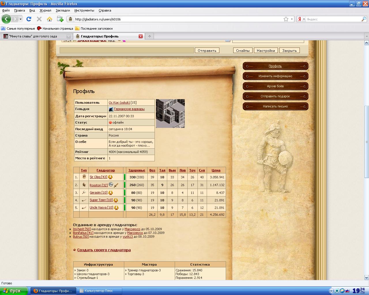 Председатель сената уж в данном случае пользовался этим активно как и некоторые личности из его гильдии. Учитывая стоимость гладиатора его мог взять каждый и желающих много было, но тем не менее брали только 2 игрока в основном, и я сомневаюсь что это баг, в данном случае многие хотят сдать гладов в аренду и выставлены все однако не сдаются Имхо. Фраза про баг и определение ему принадлежит не вам. ну и к тому же можно просмотреть лигу чемпионов и чемпионат, как и прошлый созыв и по времени определить даже максимальное количество в аренде... Гладиаторы у Оскока всегда находятся в отряде у Юрика и Максимусо. Все тайное рано или поздно становится явным. Ну а , что касается Чистая.. Не думаю, что он просто вот так вот не вышел, не в его это интересах и правилах, даже просмотреть сетку лиги у максимусо было больше возможностей да и денег на аренду и борьбу, хотя финал заранее был бы проигран, ибо рожденный ползать летать не может. Понятие мульт относительное, в случае бана отдельного игрока всегда можно заходить за кого угодно и с другого компа, да и можно его динамическим сделать. под категорию мульт подпадает по моему мнению рефералы и набивание как раньше рейтинга, аренда, аукцион, прокачка и т.д. Лех! Я всегда относился к тебе с уважением, как к игроку и сопернику! Обвинения от тебя, которого раз 5 на моей памяти банили и предупреждали за юзание багов, как минимум смешны, попахивает дешевой попыткой свести счеты, правда непонятно за что! Научись наконец проигрывать достойно! -------------------- homo homini lupus est