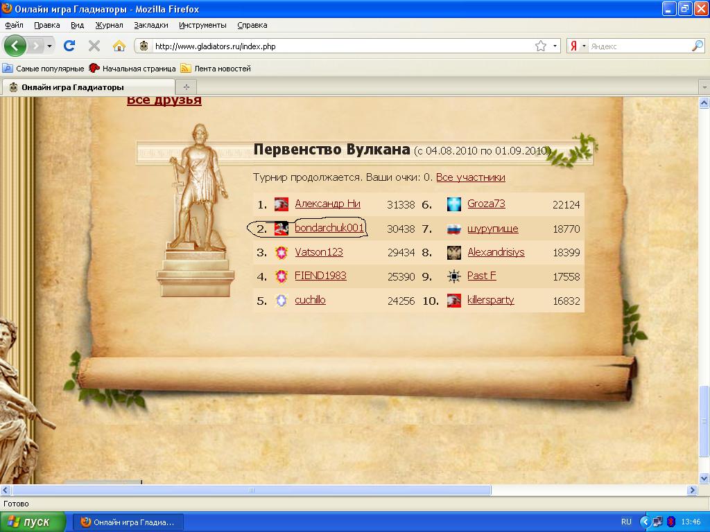 Меня уволили из гильдии Диктаторы Рима за то что я отказался удалить из профиля друзей, которые сами вышли из гильдии. Глава гильдии bondarchuk001 в новостях объявил их врагами гильдии и настойчиво предложил удалить их. Когда я отказался, bondarchuk001 перевел меня в рекрут-гильдию и дал сутки на удаление. Я друзей конечно не удалил. На следующий день обнаружил, что я уже не в гильдии. В гильдии не проводятся ни МГТ ни ВГТ не ведутся войны. bondarchuk001 заставляет молодых ланист заходить с ним в турниры, где они потом пропускают его в финал, не выставляя на бой гладиаторов. Это легко увидеть в его архиве боев. Возможно целью создания гильдии Диктаторы Рима является получение дополнительных игровых возможностей для bondarchuk001. А остальным членам гильдии надоело быть его свитой и они начали уходить. И тут-же стали врагами гильдии. )