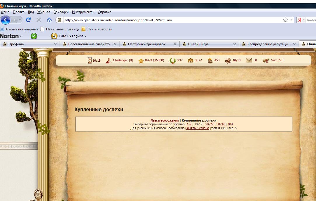 Подскажите, почему распределив очки репутации в Оружейной лавке до 10, НЕ ПОЛУЧИЛ гарантированного появления по одному золотому и одному серебряному комплекту экипировки в каждом диапазоне уровней? В то время как на сайте игры в закладке «Распределение репутации» обещается: «• При достижении максимального уровня предоставляются дополнительные выгоды: • Таверна + Рынок рабов = 10 Дает дополнительный слот • Оружейная лавка = 10 Гарантированное появление по одному золотому и одному серебряному комплекту экипировки в каждом диапазоне уровней • Дом ростовщика = 10 Возможность досрочного возврата кредита • Аренда + Аукцион = 10 Дает дополнительный слот, а также снижает налог на покупку и продажу гладиаторов до 5% • Уровень = 10 Возможность создать и получить в свой отряд гладиатора таланта 10, самому выбрать его имя, тип и национальность» Пытался получить ответ в службе поддержки, однако никого вразумительного ответа не было а где вы вычитали что вам полагаеться горонтированный серебрянный и золотой доспех на каждый уровень гладов? -------------------- Все кто пишет что игрой правит рандом и у них всегда 100% правильные настройки и только из-за рандома они проигрывают советую задуматься почему на любых уровнях гладов всегда есть группа игроков которая постоянно в турах на 1 ролях? если бы игрой правил рандом а не умение тактически мыслить не было бы лидеров в каждом типе гладов будь то: 10,20,30 типы не важно.