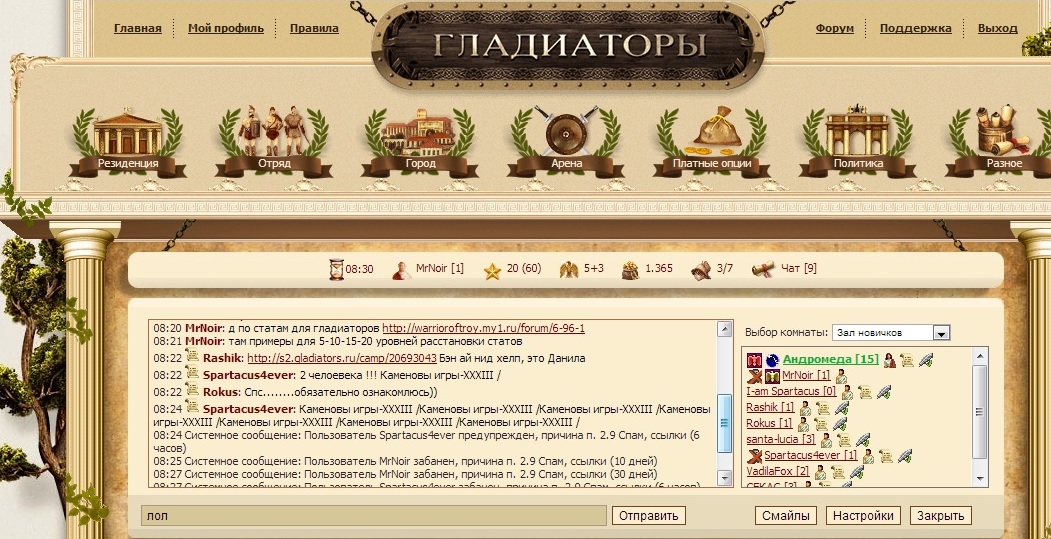 Добрый день. Хочу попросить Вас взять под контроль эту тему на форуме http://forum.gladiators.ru/index.php?showtopic=56515 . Думаю тема актуальна. Тем более что последнее время популярность форума резко упала, а эта тема вдохнула в него жизнь. Просто если за темой отдельно не следить, то в скором времени ее можно будет закрывать за флуд. Посмотрите количество просмотров темы. Оно говорит само за себя. После закрытия сената вообще популярность игры упала резко, многие ради общения и заходили сюда |