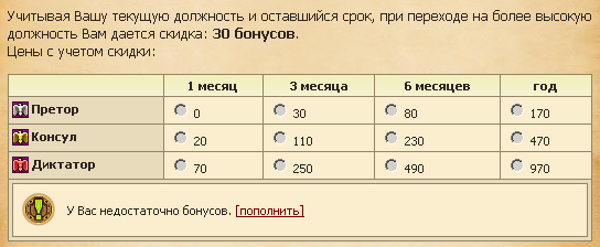 Промахнулся при покупке должности вместо претора на месяц купил квестора на 3 месяца. В разделе перехода на более высокую должность написано "Учитывая Вашу текущую должность и оставшийся срок, при переходе на более высокую должность Вам дается скидка: 30 бонусов."